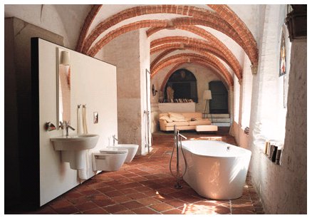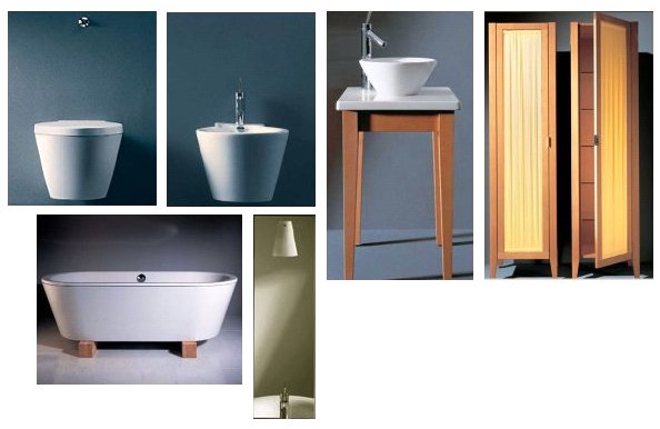 Clockwise: Philippe Starck toilet, bidet, vanity table, armoire, illuminated mirror, and footed tub |